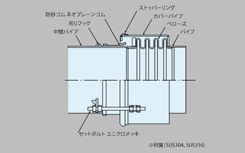 弁室などの構造物の出入り口や軟弱地盤での沈下対策を目的とした継手。鋼製構造による耐久性を持ちながら曲げ・伸縮性能も備えているため、地盤沈下や地震などの振動への対応が求められる配管環境に有効です。