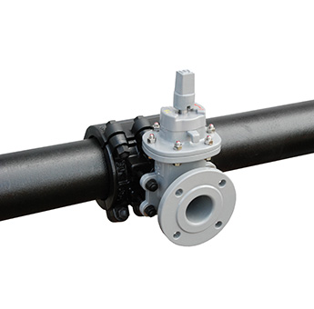 既設本管から断水せずに分岐管を取り出せる割T字管。3片構造と全周ゴムパッキンにより確実な装着と水密性を実現しています。管種・口径に応じたS型・V型・VK型・F型を展開。